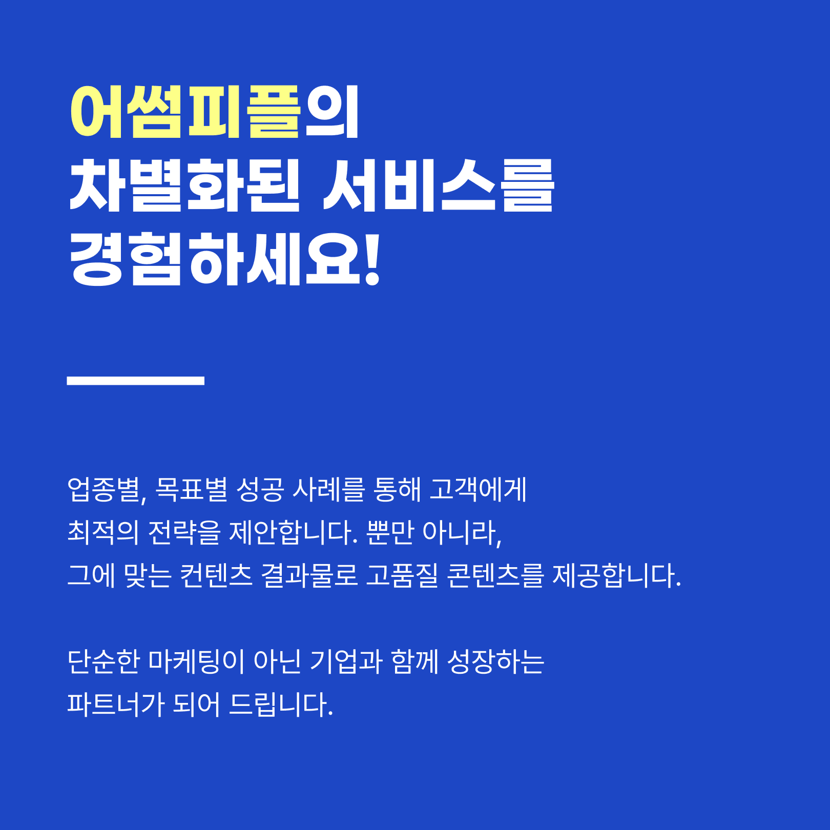 업종별, 목표별 성공 사례를 통해 고객에게 최적의 전략을 제안하고 있는데요. 뛰어난 글쓰기 능력과 디자인 감각을 갖춘 전문적인 콘텐츠 제작팀이 고품질 콘텐츠를 제작하고 있습니다.